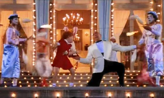 At 0:08:20, during "It's the Hard Knock Life," a girl in the orphanage