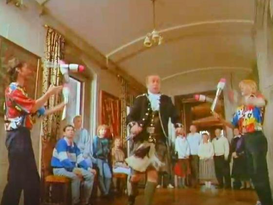 At 1:13:35, and for the next minute, we see juggling 3 clubs, a unicycle,