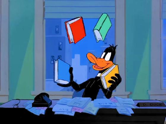 At 1:00:16, Daffy Duck juggles 4 books while filling out his income