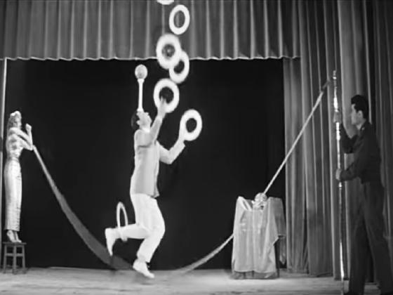 with spinning a ring on one leg while balancing a stick on his forehead