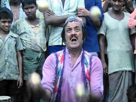 At 0:42:55, Kamu Mukherjee, playing Harun, is doing a street show