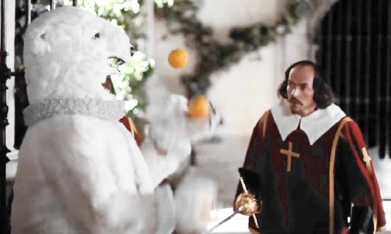At 1:35:43, someone in a polar bear costume juggles 3 oranges for